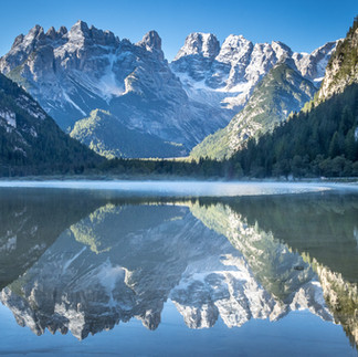 21st September, 2022 Today we met Eva's friend, Melanie, who was to join us on our trip to the Dolomites. It made for an interesting group as Melanie spoke only German; Lourdes spoke only Spanish, I spoke English and Spanish and no German; Eva spoke German, English and no Spanish! We didn't find too much trouble communicating though, hands were used a lot and facial expresions go a long way; there was lots of laughter. As we were loading the car, we were treated to a gorgeous sunrise which turned the mountain tops golden above the cloud in the valleys. Spirits were high with such a send off! Our first stop came suddenly! We were on our way to Lake Misurina when we passed a body of water which had mist rising from it. Calls of 'stop' saw us pour out of the car and start to do our own thing to capture some images. The water was like glass and the reflections so sharp. The mist above the water shimmered tantalisingly before it began to rise and dissipate. What was most noticeable however, was the freezing cold; the sort of cold which hurts the face! We piled back into the car with heater full blast and left Lake Duerrensee and carried on to Lake Misurina. The sun was out around much of this lake and so we were able to warm up, aided somewhat by a drink of hot chocolate! Although Lake Misurina was more well known than Lake Duerrensee, it was possible to see how over-run it would be during summer months. Lake Duerrensee was much more unspoilt and as there were no amenities, for me, the better location in spite of the cold! One more stop alongside yet more water where the sun was coming through the trees and creating a lovely backlit scene, then we joined the queue to actually get into the national park area of the Dolomites and leave the car. For one hour we nudged slowly forward watching the barrier go up on the exit side, meaning another car could enter. It cost 30€ to enter and park, however at least we were able to get in!